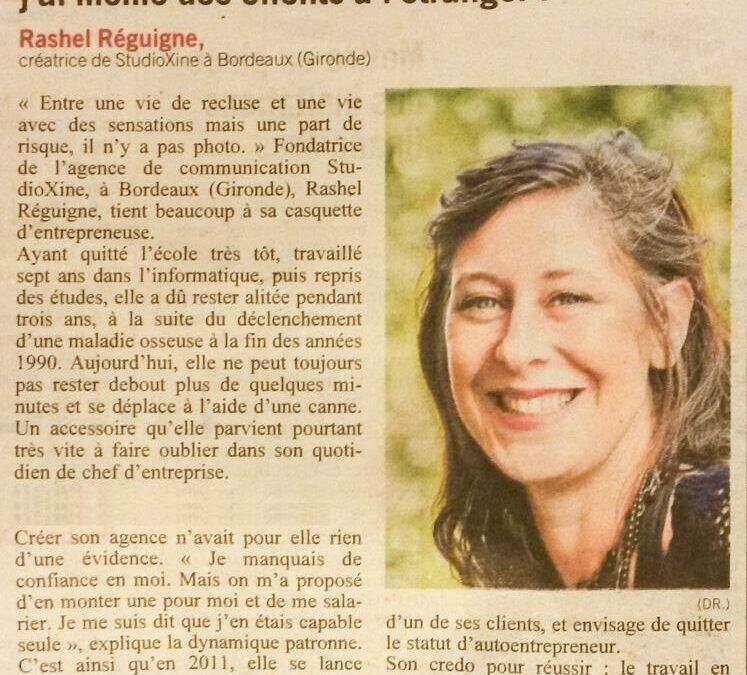 Article dans « Le Parisien » et dans « Aujourd’hui en France » du 17 novembre 2014 dans le dossier sur le handicap et l’entrepreneuriat. Rashel Réguigne, créatrice de StudioXine Communication à Bordeaux (Gironde) : « Je suis fière de travailler à mon...